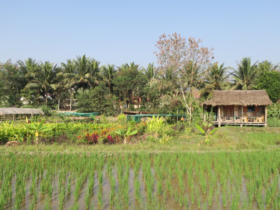 After a lovely two-day cruise down the Mekong River, with an overnight stay in Pakbeng, we arrived in Luang Prabang, a UNESCO World Heritage site that offers all the charm and excitement for a first time visit to Laos. Some travelers have told us that they don’t consider Luang Prabang to be the “real Laos” given that most of the country is very poor, and while we could easily agree, Luang Prabang connected us with wonderful people, tasty cuisine and beautiful sites. In addition to visiting many wats, we conquered one of the main sites: Kuang Si Falls. This waterfall offers visitors turquoise colored pools to swim in along the hike, and a slippery if not dangerous, trek up the side of the falls to the water source. However, the main attraction for us, and the one that brought us pure joy, was an overnight homestay at The Living Land Company, a community-run organic farm that supplies fresh vegetables, herbs and rice to local restaurants and hotels.